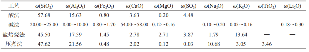 目前,鋰礦石的主要提鋰工藝有酸法工藝、堿法工藝、鹽焙燒工藝、壓煮工藝等,因提鋰工藝的不同,會導致在提鋰過程中產生的鋰渣理化性質存在差異,但鋰渣的主體為SiO2和Al2O3,且含有一定量的鈉鹽和堿成分。