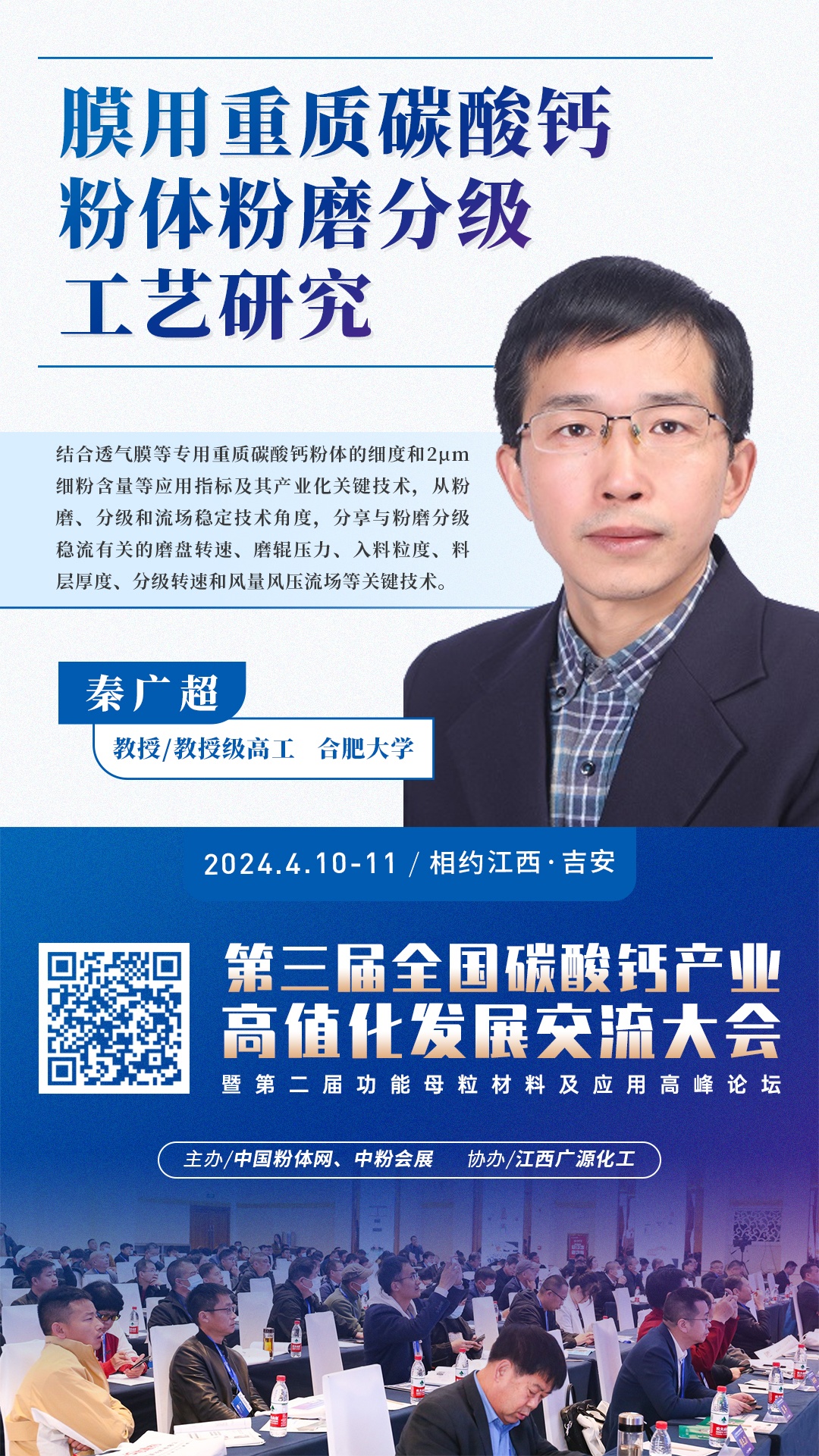 2024年4月10日~11日,第三屆全國碳酸鈣產(chǎn)業(yè)高值化發(fā)展交流大會將在江西·吉安舉行,屆時合肥大學(xué)秦廣超教授將在大會上作《膜用重質(zhì)碳酸鈣粉體粉磨分級工藝研究》主題報告,結(jié)合透氣膜等專用重質(zhì)碳酸鈣粉體產(chǎn)業(yè)化關(guān)鍵技術(shù),從粉磨、分級和流場穩(wěn)定技術(shù)角度,為大家做專業(yè)講解和匯報。