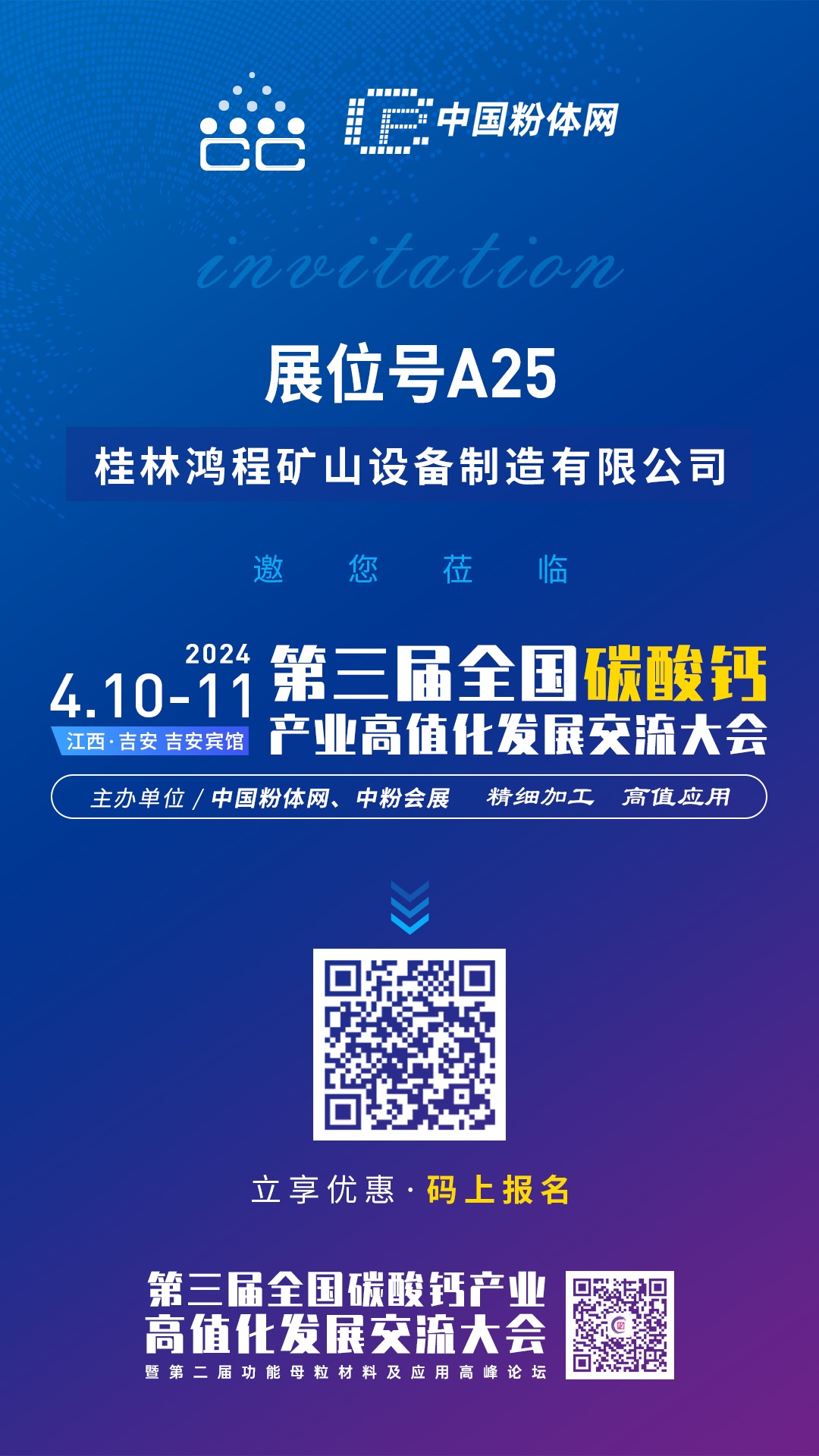 由中國粉體網主辦的“2024第三屆全國碳酸鈣交流會”將于2024年4月10-11號在江西吉安舉辦,桂林鴻程礦山設備邀您一同參加。