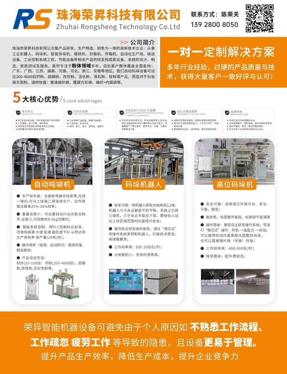 珠海市榮昇科技有限公司集產品研發、生產制造、銷售為一體的高新技術企業,從事工業機器人、碼垛機、智能拆垛機、纏繞機、封箱機、開箱機、自動化生產線、輸送設備、工業控制系統工程,節能設備等相關產品的研發和成套設備,系統的設計、制造、安裝調試及服務。我司專注于粉體領域多年,目前客戶群體覆蓋全國各地:廣東、廣西、江西、湖南、河南、河北、浙江、安徽等地區。我們自動碼垛設備可適應200-4000目鈣粉、超細粉、改性粉、活化粉、滑石粉、硅粉等產品,而且對于包裝袋無限制、通用性強:普通編織袋、覆膜方形袋、編織+內膜袋等。