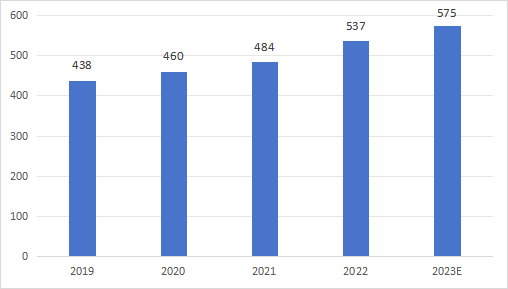 圖2 2019-2023年中國MLCC市場規模及預測(單位:億元)