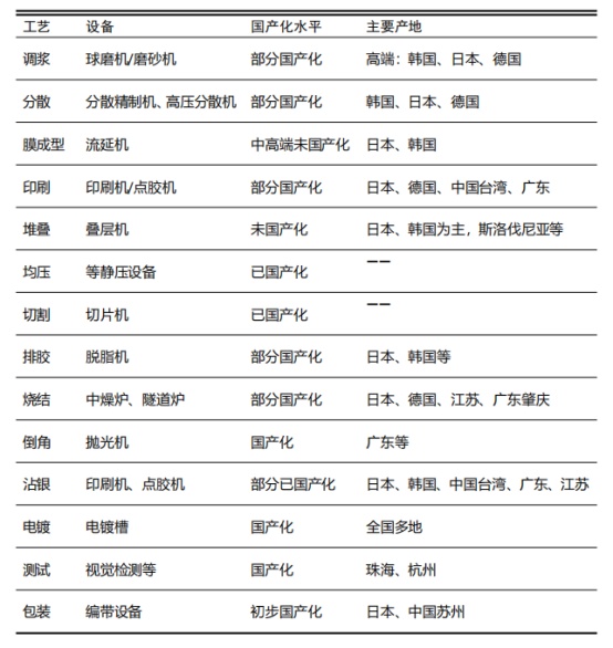 除了材料、工藝之外,先進性的設備也會影響高端MLCC的性能。我國在MLCC生產設備等方面已經取得了很好的國產化進步,比如倒角、電鍍、測試等方面的設備,但在流延機、疊層機、燒結爐等中高端關鍵設備尚未完全實現國產化。