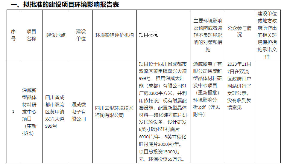 項目進展方面,成都市雙流生態環境局于2023年11月公示了通威新型晶體材料研發中心項目的環評文件,目前已通過審批。