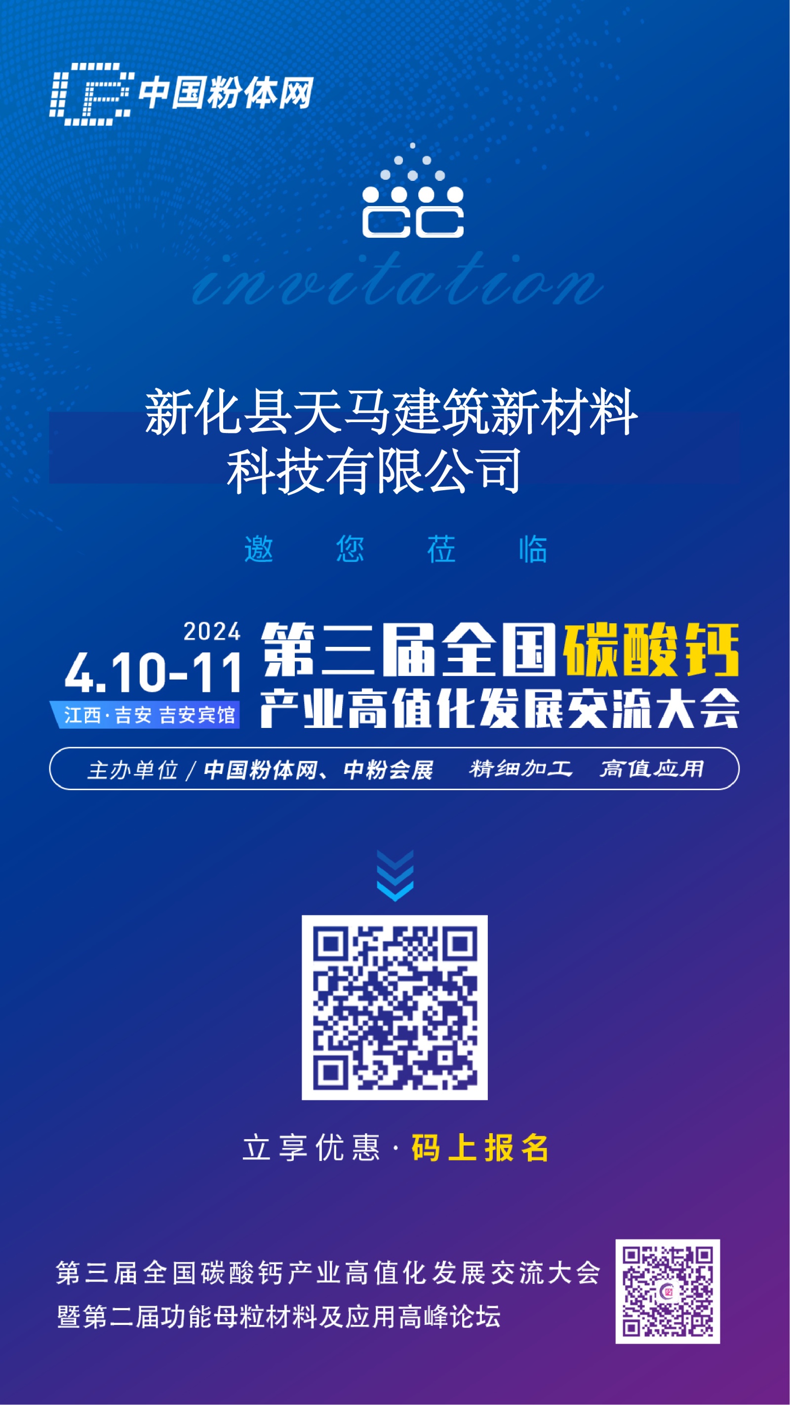由中國粉體網主辦的“2024第三屆全國碳酸鈣交流會”將于2024年4月10-11號在江西吉安舉辦,新化縣天馬建筑新材料科技有限公司邀您一同參加。