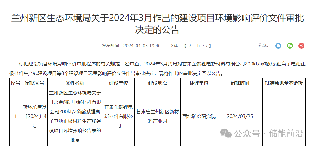 中國粉體網(wǎng)訊 4月3日,蘭州新區(qū)生態(tài)環(huán)境局發(fā)布《蘭州新區(qū)生態(tài)環(huán)境局關(guān)于甘肅金麟鋰電新材料有限公司200kt/a磷酸系鋰離子電池正極材料生產(chǎn)線建設(shè)項(xiàng)目環(huán)境影響報(bào)告表的批復(fù)》