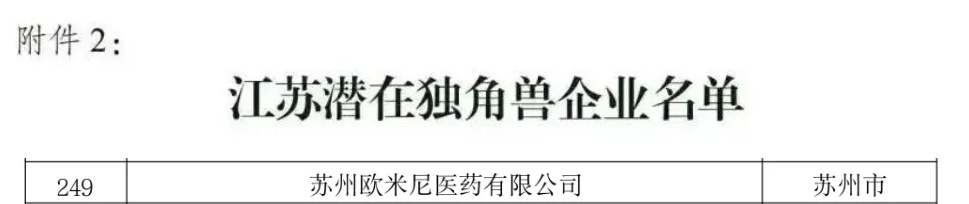 中國粉體網訊 近日,江蘇省生產力促進中心發布了2023 年江蘇獨角獸企業評估結果,蘇州歐米尼醫藥有限公司成功入選“江蘇潛在獨角獸企業”,并且這已是歐米尼醫藥第三年入選江蘇省潛在獨角獸企業。