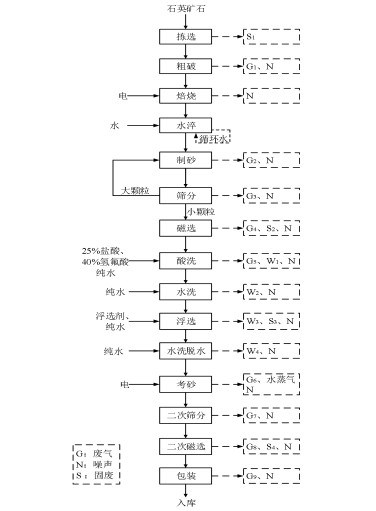 該項目以純度為99.8%的石英礦石為原料,生產高純石英砂,但技改后的具體純度是多少,尚未透露。技改后工藝為:石英石→粗破→焙燒→水淬→制砂一篩分→磁選→酸洗(在反應釜中酸洗)→水洗→浮選脫水→烤砂→篩分→磁選→包裝入庫:同時對現有公用工程進行適應性技術改造,建設污水處理站;生產廢水經過處理達標后接入工業污水處理廠。該項目建成后可形成年產5800噸石英砂的生產能力,產能不變。