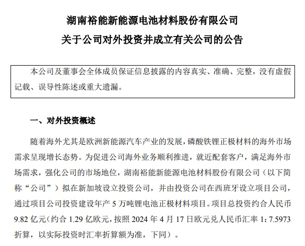 4月20日,湖南裕能發布公告稱,隨著海外尤其是歐洲新能源汽車產業的發展,磷酸鐵鋰正極材料的海外市場需求呈現增長態勢。為促進公司海外業務順利推進,就近配套客戶,滿足海外市場需求,強化公司的市場地位,公司擬在新加坡設立投資公司,并由投資公司在西班牙設立項目公司,通過項目公司投資建設年產5萬噸鋰電池正極材料項目。