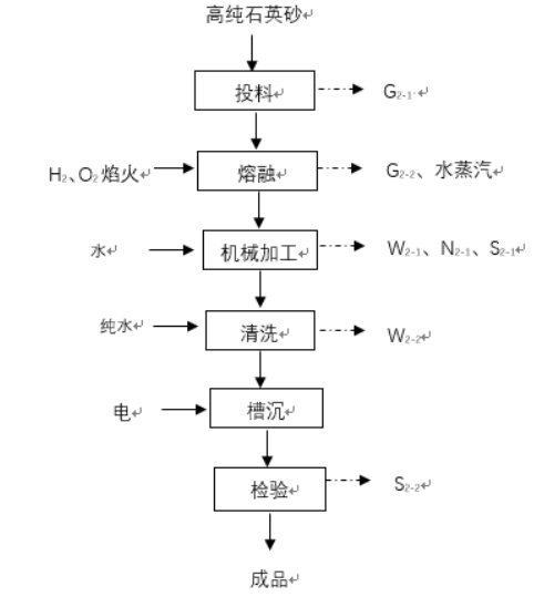 爐管采用石英管→毛坯切割、打磨整形→酸洗→高純水沖洗→烘干→熱加工→清洗→烘干→退火→檢驗包裝;石英器件采用石英管棒→毛坯切割、打磨整形→機械加工→酸洗→高純水沖洗→烘干→熱加工→清洗→烘干→退火→檢驗包裝工藝流程。