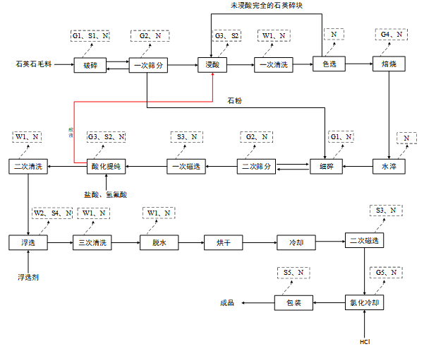 擬建項(xiàng)目高純石英砂生產(chǎn)工藝流程及產(chǎn)污環(huán)節(jié)圖