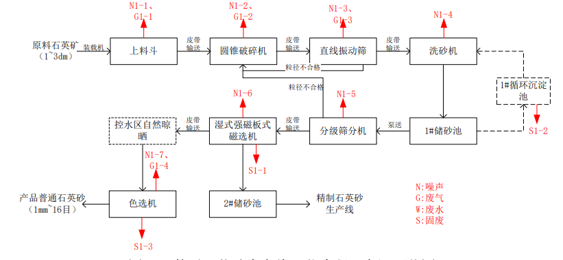 普通石英砂生產線工藝流程及產污環節圖
