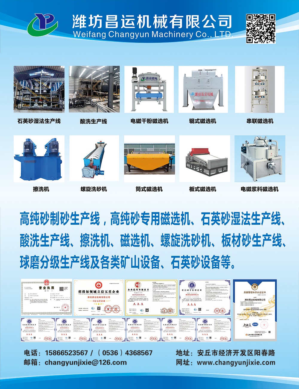 濰坊昌運機械有限公司——是一家集科研開發、工程設計、生產安裝、調試服務于一體的生產石英、長石、化工、鐵礦、煤礦專用設備和提供非金屬礦的生產試驗、設計、制造、安裝、售后服務為一體的現代化企業。服務范圍設計礦山、電力、造紙、玻璃、化工、水泥等行業。