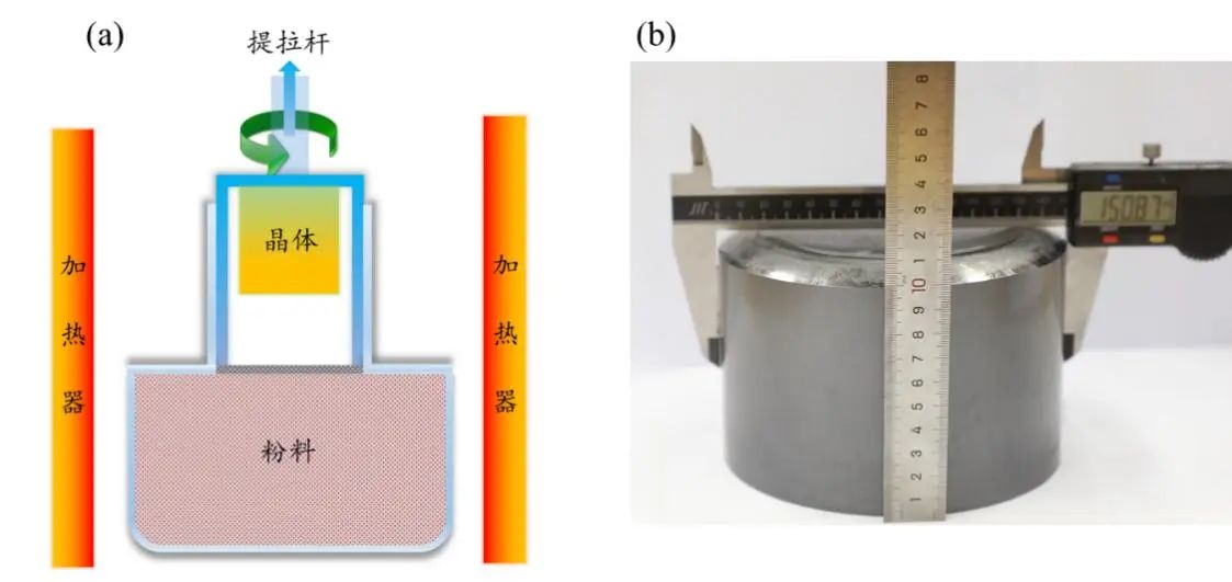 (a)提拉式物理氣相傳輸法生長(zhǎng)半導(dǎo)體碳化硅(SiC)單晶的示意圖;(b)100 mm厚半導(dǎo)體SiC單晶。