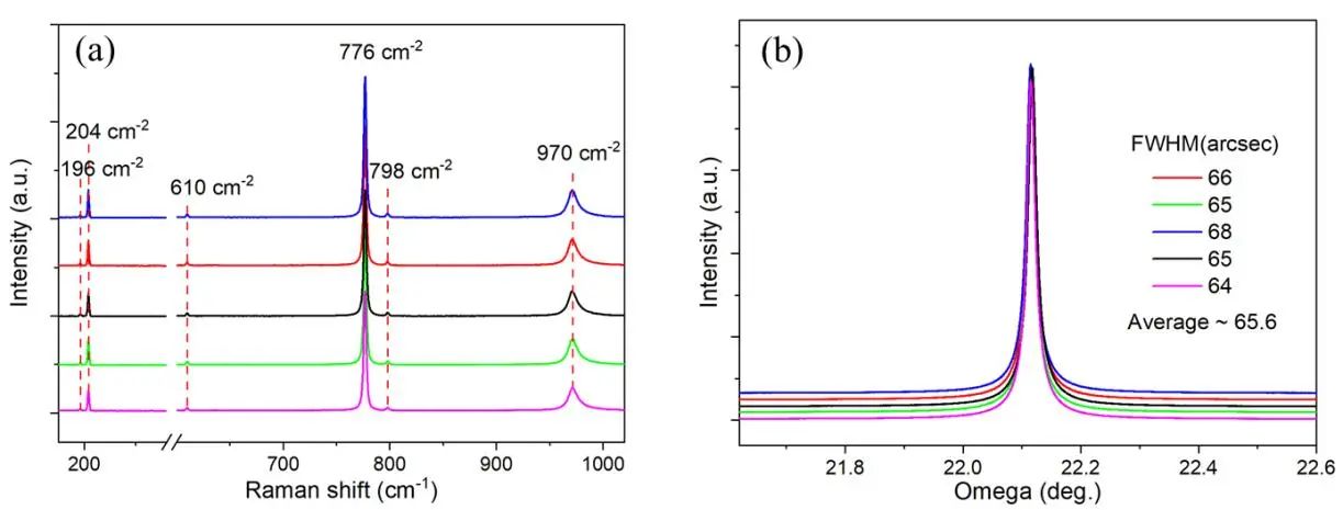 (a)拉曼散射光譜;(b)(0004)面的X射線搖擺曲線。