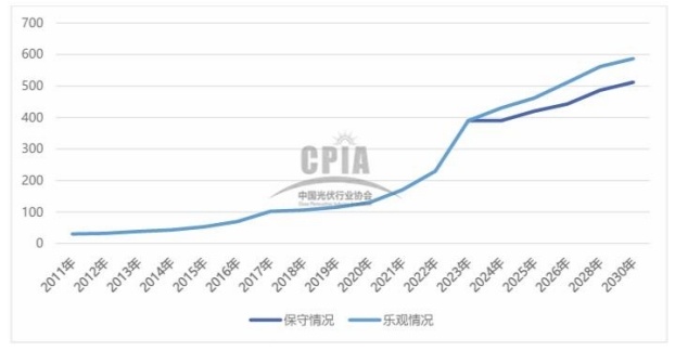 2011-2023 年全球光伏年度新增裝機(jī)規(guī)模以及2024-2030年新增規(guī)模預(yù)測(cè)(單位:GW)