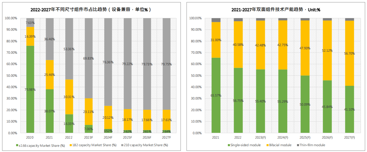 大尺寸組件主流地位確立,N型技術(shù)導(dǎo)入帶動(dòng)雙玻占比提升。