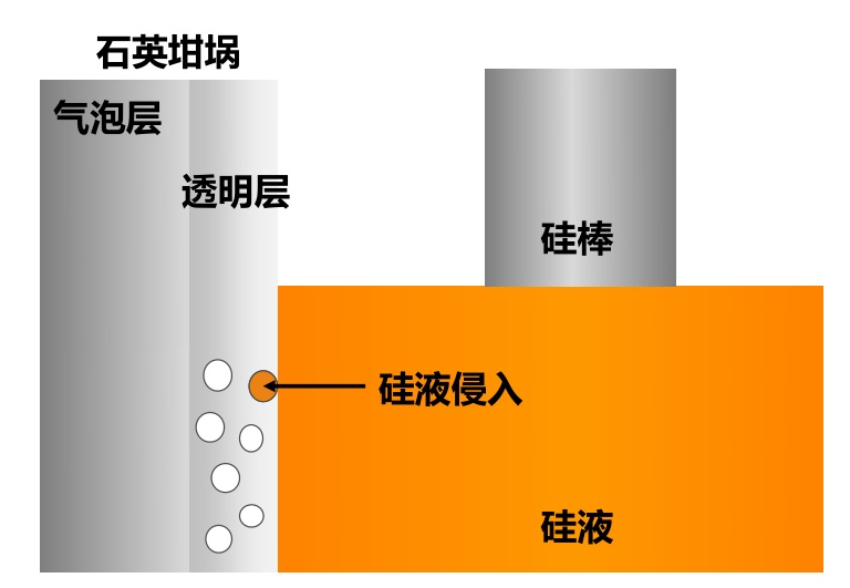 石英坩堝為半透明狀,分為外層,也叫氣泡復合層(不透明層,氣泡含量較多),以及中內層,也叫氣泡空乏層(真空透明層,不含氣泡,3~5mm)兩層結構。坩堝透明層微氣泡含量的控制會影響坩堝壽命的長短。在高溫熔制下,由于與硅液接觸的內表面不斷向硅液中熔解,并且伴隨著透明層中的微氣泡不斷長大,靠近最內表面的氣泡破裂,伴隨著硅液釋放石英微顆粒以及微氣泡。而這些雜質會以微顆粒以及微氣泡的形式伴隨著硅液流遍整個硅熔體直接影響到硅的成晶(整棒率、成晶率、加熱時間、直接加工成本等)以及單晶硅的質量(穿孔片、黑芯片等)。