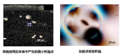 析晶主要原因是石英坩堝內外表面容易沾污,引起雜質離子的局部聚集,特別是堿離子,如K、Na、Li、Ca、Mg等高溫后引起粘度降低,促使失透加速,形成析晶。