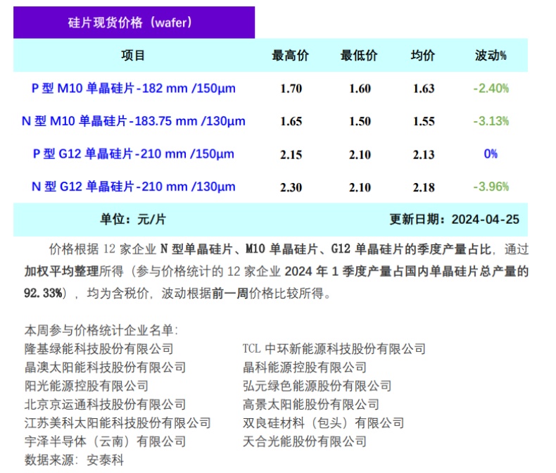 根據硅業分會4月25日數據,P型M10單晶硅片(182 mm /150μm)成交均價降至1.63元/片,周環比跌幅為2.4%;N型M10單晶硅片(183.75 mm /130μm/256mm)成交均價降至1.55元/片,周環比跌幅3.13%;P型G12單晶硅片(210 mm/150μm)成交均價維持在2.13元/片,周環比持平。N型G12單晶硅片(210 mm/150μm)成交均價為2.18元/片,周環比下跌3.96%。