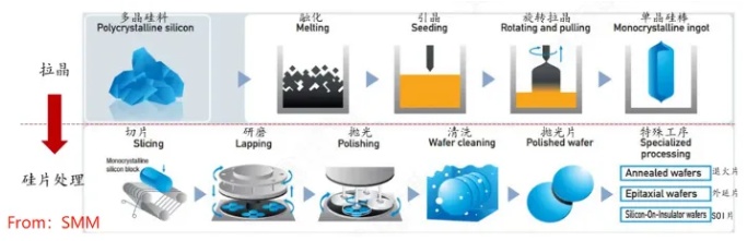 硅片生產是技術密集型產業,涉及從高純多晶硅到高質量單晶硅的轉變,再到最終的硅片制備。首先,將純凈的多晶硅和少量摻雜劑(如硼或磷)放入石英坩堝中,加熱至熔融狀態。然后,將一根單晶硅種子晶體插入熔融硅中。當種子晶體緩慢上升并旋轉時,熔融硅沿種子的晶向結構生長。這個過程叫拉晶,而如此制作出來的就是單晶硅棒。