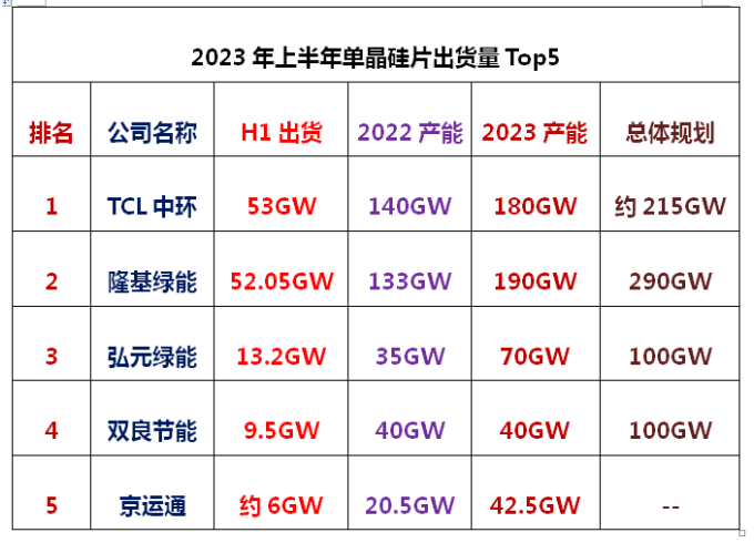 TCL中環2023上半年實現單晶硅片出貨53GW,總出貨數據略高于隆基綠能, TCL中環硅片主要以外銷為主,因此對外銷售的硅片量應遠高于隆基。