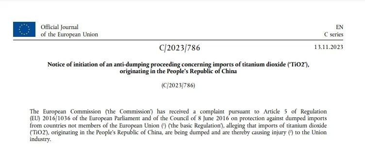 2023年11月13日,歐盟在其官網發布公告,宣布對歐盟自中國進口的鈦白粉產品(氧化鈦、二氧化鈦基顏料和制劑Titanium Dioxide,“TiO2”)發起反傾銷調查。