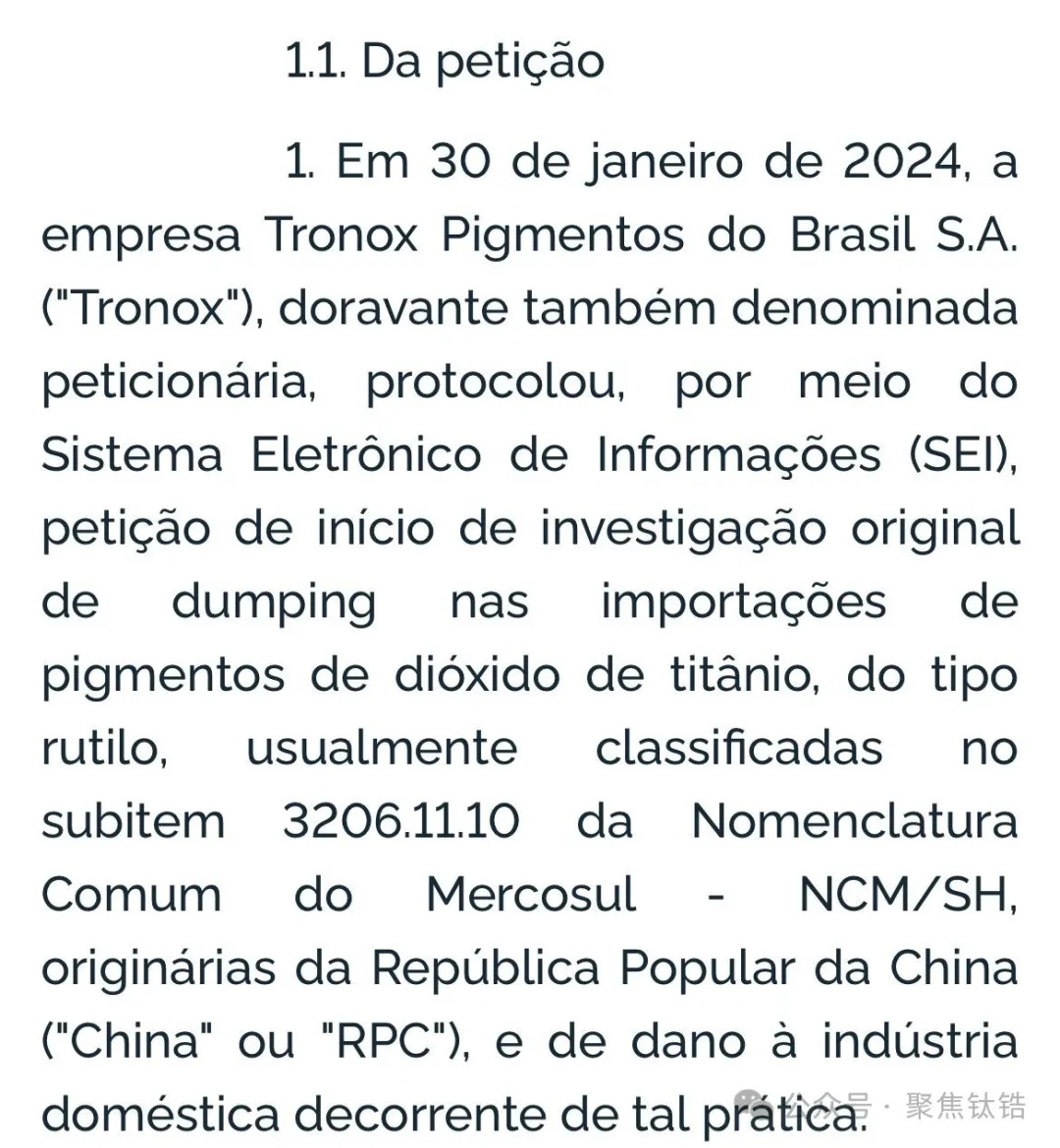 4月30日,巴西發布2024年第15號公告稱,應巴西國內企業Tronox Pigmentosdo BrasilS.A.提交的申請,對原產于中國的金紅石型二氧化鈦發起反傾銷調查,涉案產品為金紅石型鈦白粉顏料。