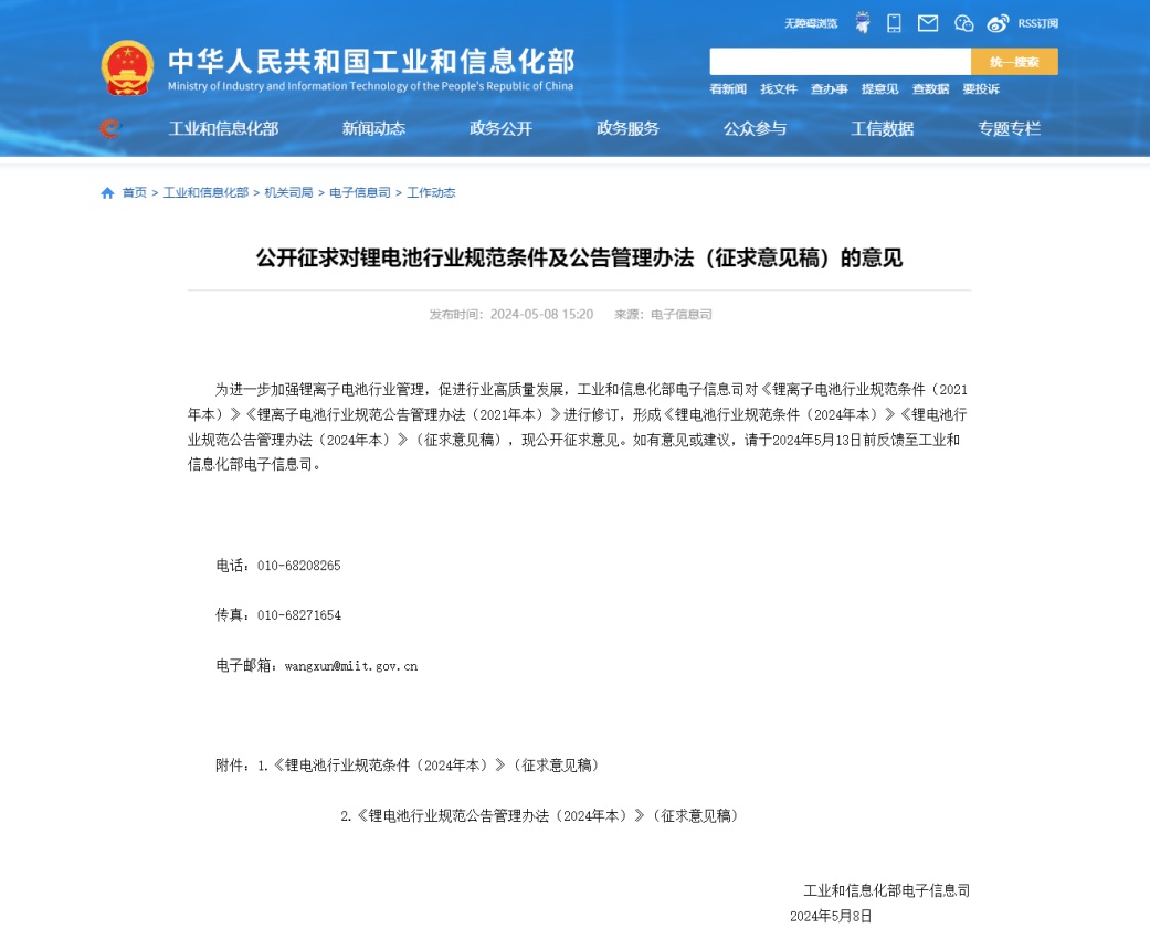 中國粉體網訊 5月8日,為進一步加強鋰離子電池行業管理,促進行業高質量發展,工業和信息化部電子信息司對《鋰離子電池行業規范條件(2021年本)》《鋰離子電池行業規范公告管理辦法(2021年本)》進行修訂,形成《鋰電池行業規范條件(2024年本)》《鋰電池行業規范公告管理辦法(2024年本)》(征求意見稿),現公開征求意見。