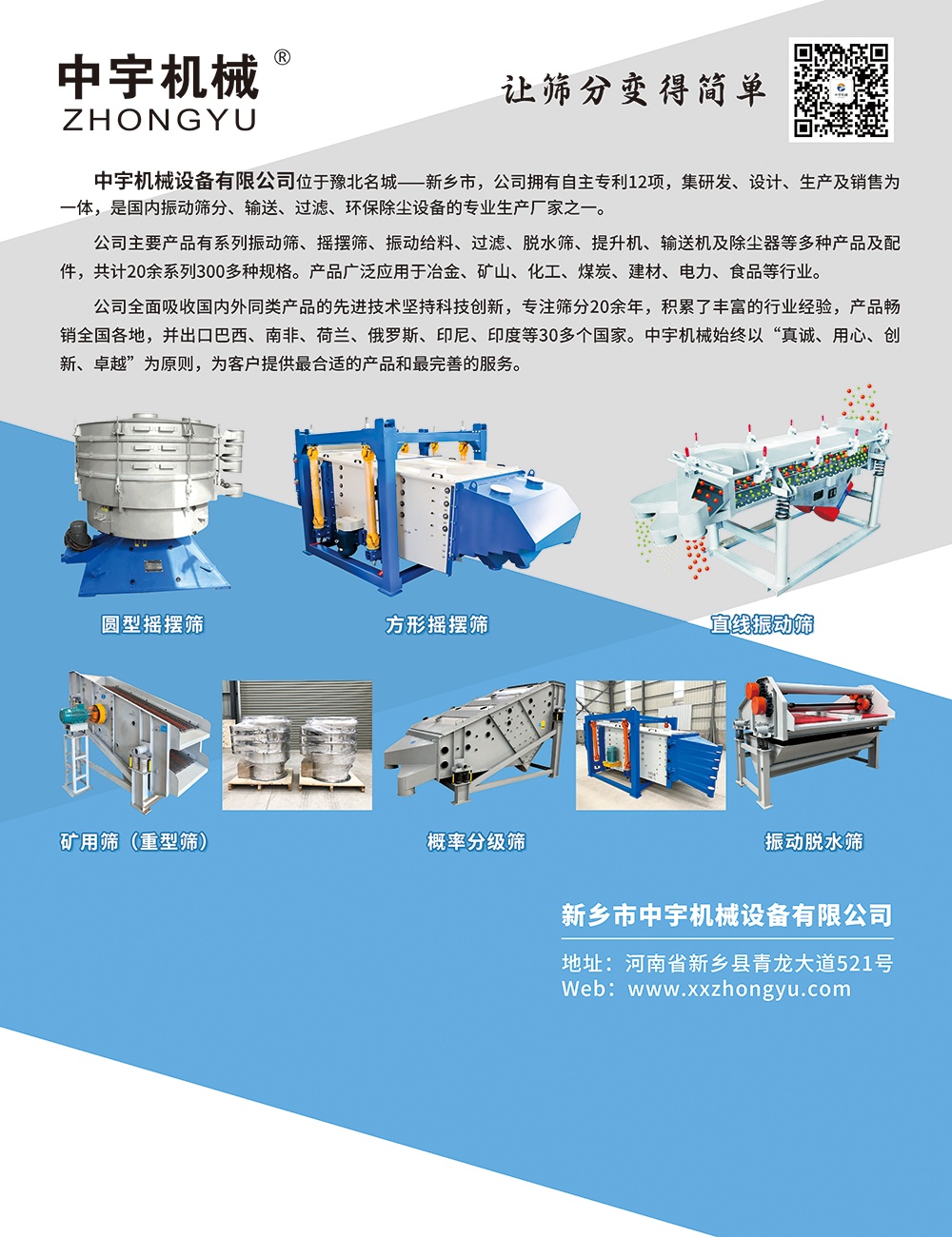 新鄉市中宇機械設備有限公司是一家生產直線振動篩、振動給料設備、振動輸送機、精搖篩、篩板、脈沖除塵器等產品的廠家,位于豫北名城---新鄉市,地處中原腹地城市,交通便利,京廣、新菏鐵路、107國道及京港澳、大廣、濟東高速穿境而過。