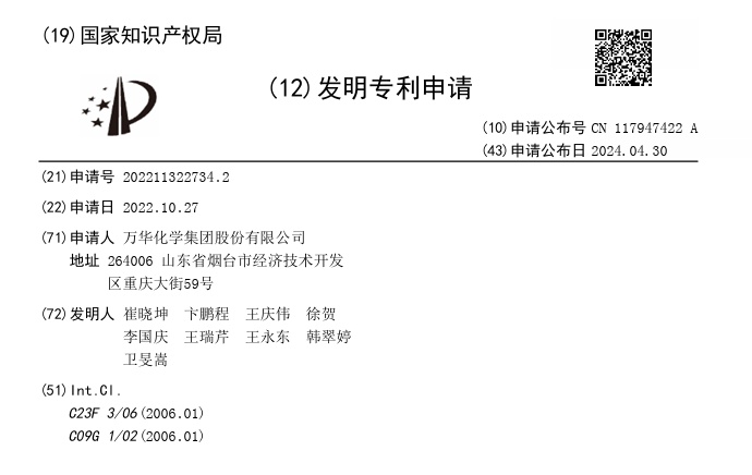 中國粉體網訊 據國家知識產權局公告,萬華化學集團股份有限公司(以上簡稱:萬華化學)申請一項名為“一種長時間高速率的鎢化學機械拋光液及其應用“,公開號CN117947422A。