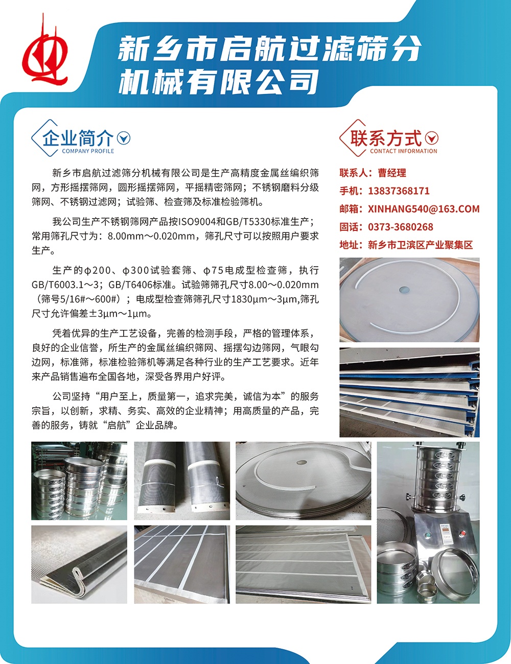 新鄉(xiāng)市啟航過濾篩分機械有限公司是生產(chǎn)振動篩分設(shè)備、高精度金屬絲、篩網(wǎng)、篩分檢測用具、不銹鋼濾網(wǎng) 、過濾器、過濾設(shè)備的專業(yè)企業(yè)。憑著先進的生產(chǎn)工藝設(shè)備,完善的檢測手段,嚴格的管理體系,良好的企業(yè)信譽,所生產(chǎn)的振動篩、金屬絲篩網(wǎng)、過濾器,滿足各種行業(yè)的生產(chǎn)工藝要求。近年來,各類機型銷售已達數(shù)萬臺,產(chǎn)品遍布全國各地,深受各界好評。
