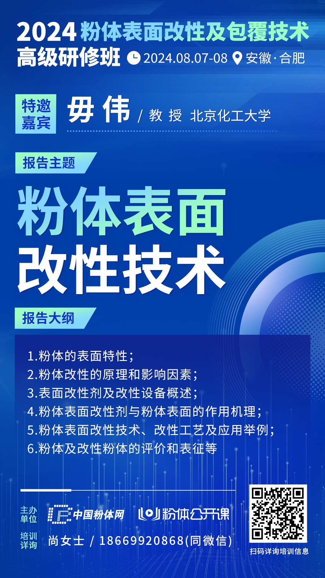 由于粉體表面的改性目的、改性工藝以及改性效果評價方法等有很大不同。特此,中國粉體網定于2024年8月7-8號在安徽·合肥組織召開2024第五屆粉體表面改性及包覆技術高級研修班,邀請行業專家學者一起面對面交流探討。