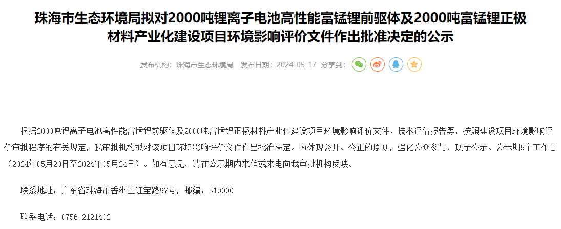 中國粉體網訊  近日,廣東珠海市生態環境局擬對珠海冠啟新材料有限公司2000噸鋰離子電池高性能富錳鋰前驅體及2000噸富錳鋰正極材料產業化建設項目環境影響評價文件作出批準決定的公示。