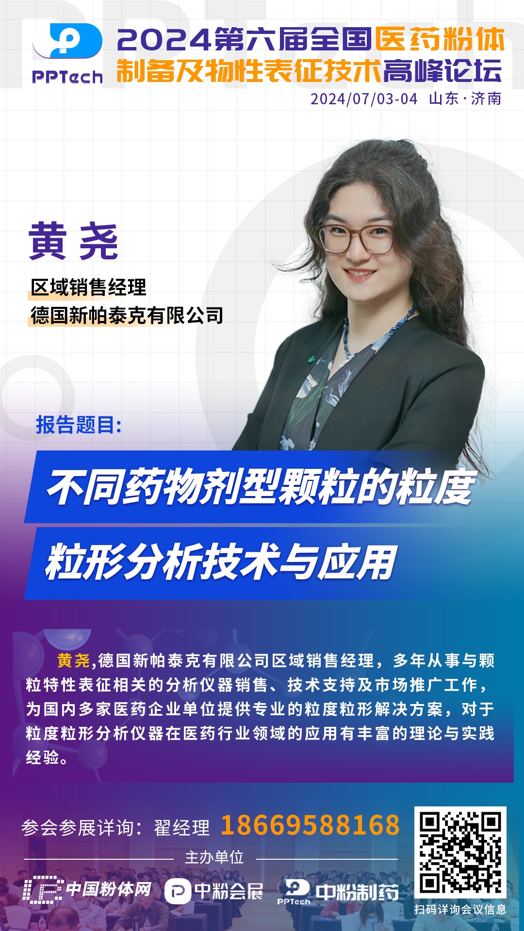 2024年7月3-4日,中國粉體網以“從粉體技術,論制藥工藝”為主題,將在山東的濟南中海凱驪酒店舉辦“第六屆全國醫藥粉體制備及物性表征技術高峰論壇”,屆時來自德國新帕泰克有限公司黃堯銷售經理將作《不同藥物劑型顆粒的粒度粒形分析技術與應用》報告,基于德國新帕泰克產品線,報告主講人將介紹不同藥物劑型顆粒的粒度粒形分析技術與應用。通過理論講解和實際案例分享,幫助從業者提升生產效率與產品質量。