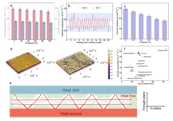在BNNS約為32wt%~35wt%的低添加含量下,該納米復合材料具有26.58W/m·K~29.38W/m·K的高面內熱導率,并且熱阻隨著預拉伸程度的增加而顯著降低。另外,研究團隊通過有限元分析證明褶皺結構有利于熱流傳輸,可以改善復合材料垂直方向的導熱性能。