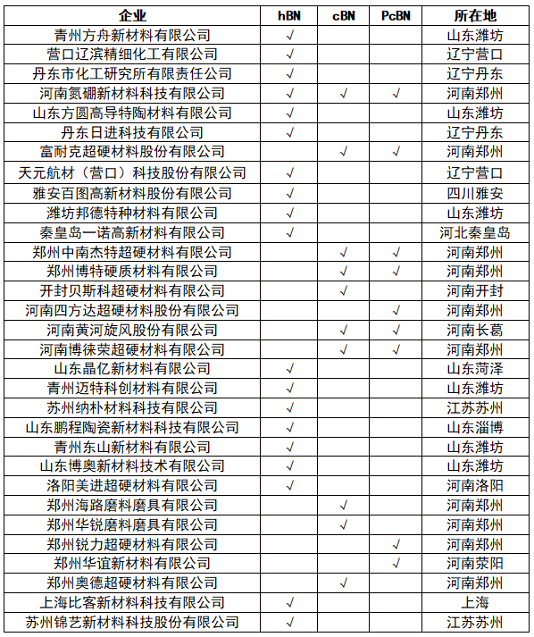 目前,國內從六方氮化硼到立方氮化硼再到聚晶立方氮化硼,已經初步形成了完整的產業鏈條。部分氮化硼生產企業及生產情況如下: