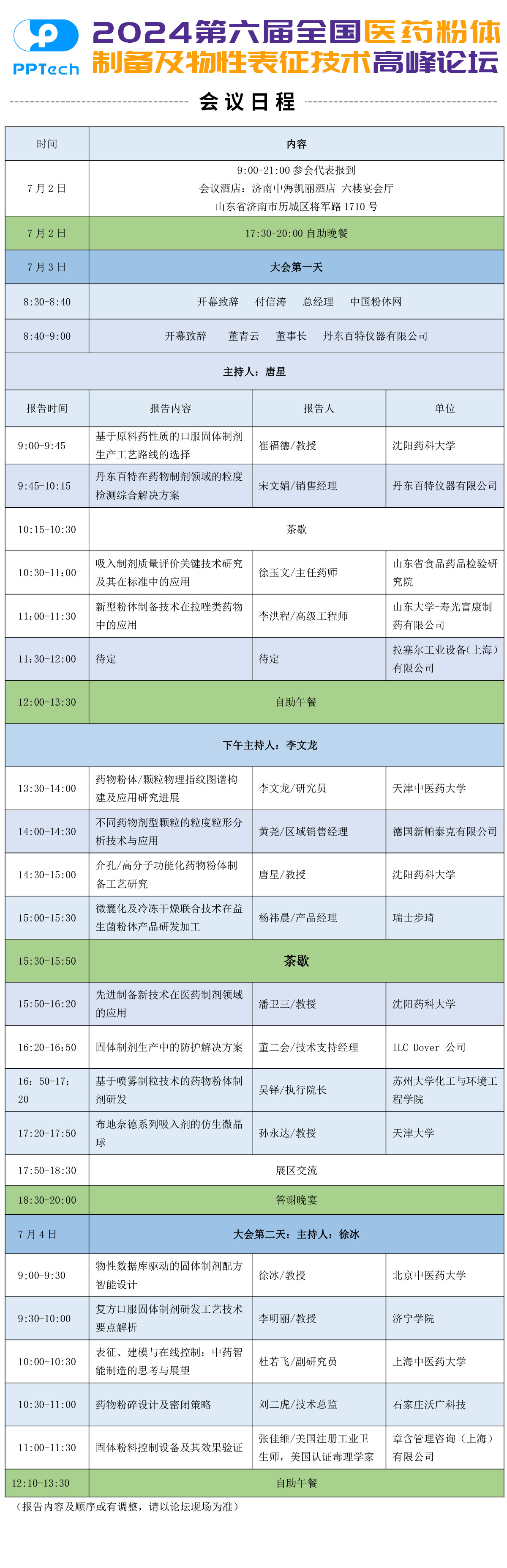 第六屆全國(guó)醫(yī)藥粉體制備及物性表征高峰論壇將于2024年7月3-4日,在山東 濟(jì)南中海凱麗酒店舉辦,7月2號(hào)全天報(bào)到,會(huì)議日程及交通圖如下,請(qǐng)您安排好行程,按時(shí)參會(huì)。