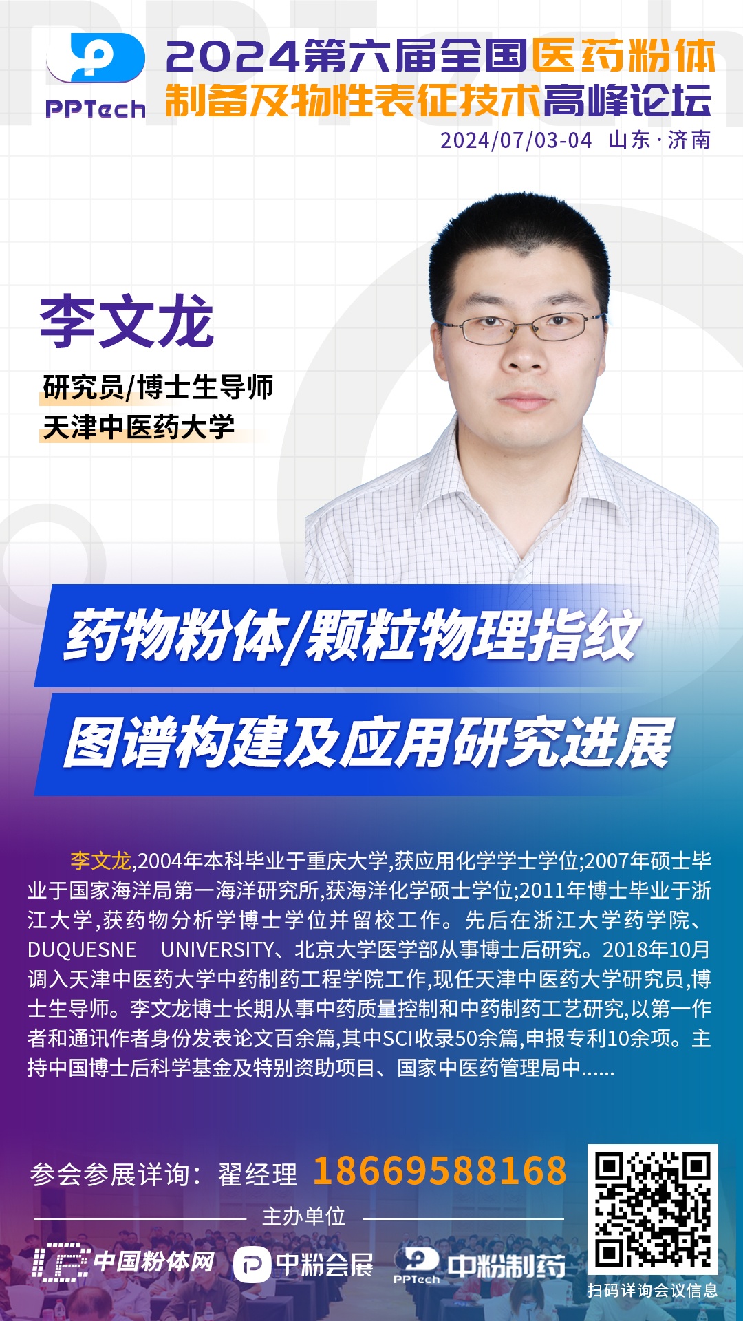 2024年7月3-4日,中國粉體網以“從粉體技術,論制藥工藝”為主題,將在山東的濟南中海凱驪酒店舉辦“第六屆全國醫藥粉體制備及物性表征技術高峰論壇”,屆時來自天津中醫藥大學的李文龍研究員將作《藥物粉體/顆粒物理指紋圖譜構建及應用研究進展》報告,報告主講人將為我們介紹中藥粉體物理指紋圖譜轉化研究,物理指紋圖譜在中藥粉體、藥用輔料質量一致性評價和制劑處方設計中的應用以及未來的研究方向。