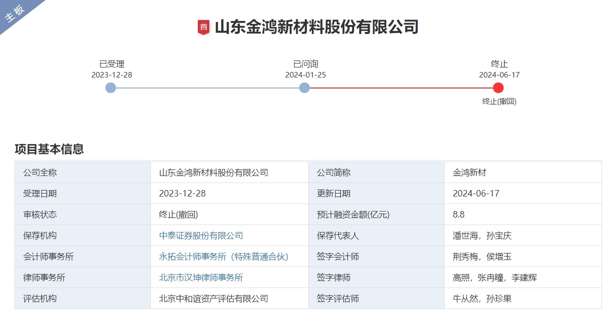 中國粉體網訊 近日,山東金鴻新材料股份有限公司(以下簡稱“金鴻新材”)的深主板IPO審核狀態變更為“終止”,原因系該公司及其保薦人中泰證券股份有限公司撤回發行上市申請。