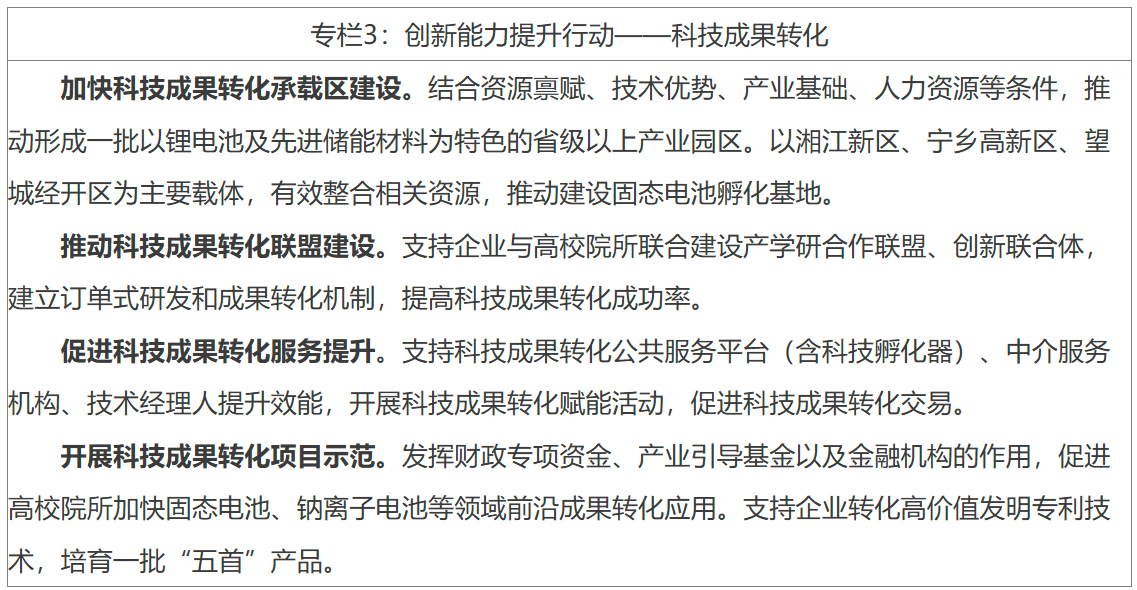 聚焦鋰電池及先進儲能材料科技成果轉化堵點、卡點和重點,構建“科技成果轉化承載區+科技成果轉化聯盟+科技成果轉化服務+科技成果轉化項目”特色科技孵化育成體系。支持企業、高校院所加快鋰電池及先進儲能材料技術和產品標準研制、推廣,形成一批企業、行業、國家標準,構建“技術研發+標準推廣+產業落地”創新生態。
