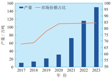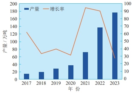 近年來,得益于新能源汽車、通信儲能、電力儲能和智能穿戴等應用領域的快速發展,鋰電池負極材料市場迎來爆發式增長。從石墨負極材料市場來看,據統計,我國鋰電池負極材料出貨量由2017年的14.9萬噸增長至2023年的176.2萬噸,年均復合增長率達50.9%。其中,人造石墨負極材料占比持續提升,市場份額由2017年的67.9%上升至2023年的84.5%。預計到2025年我國鋰電池負極材料需求將超過190萬噸,人造石墨負極材料需求將超過160萬噸。