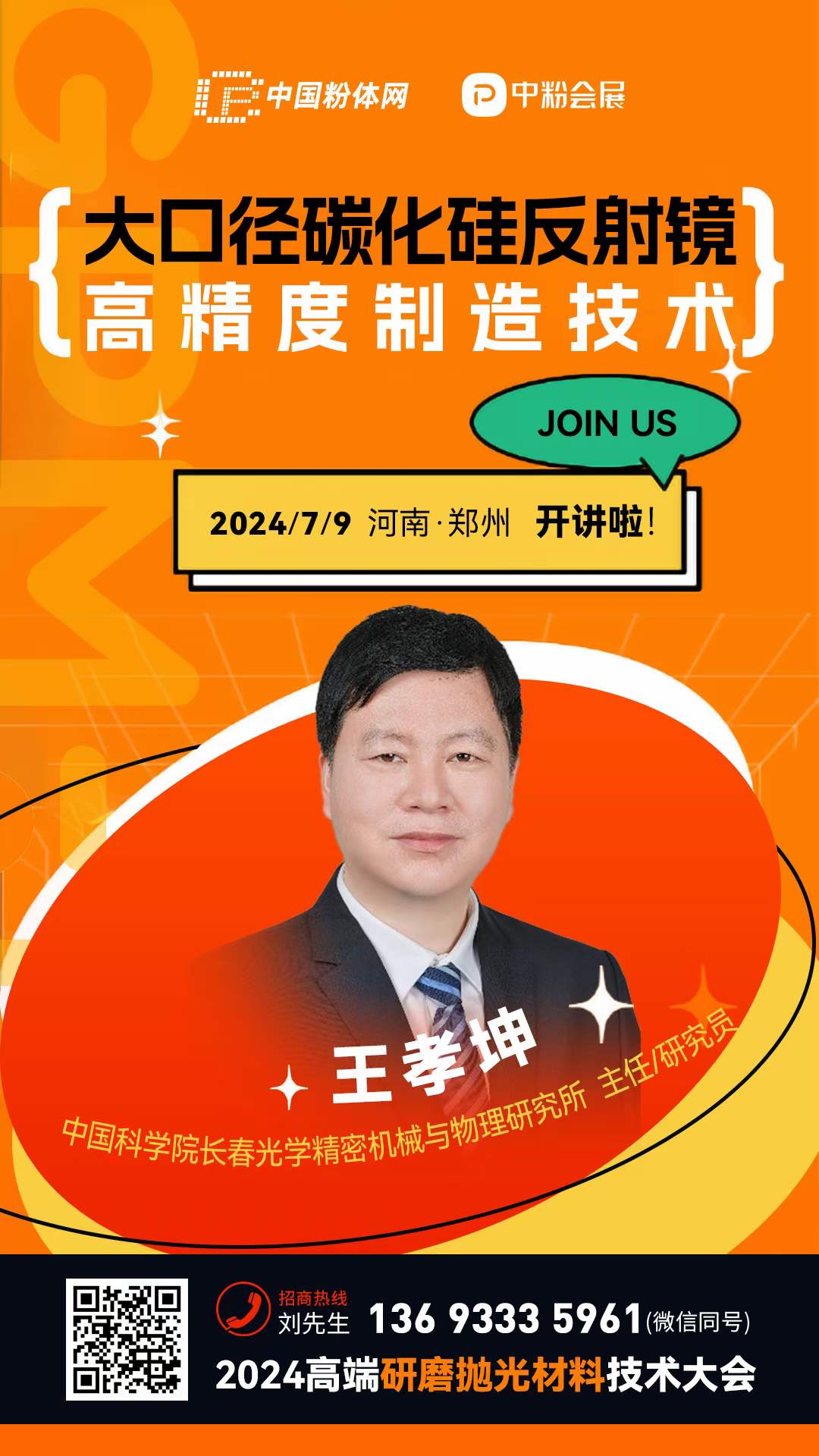 2024年7月9日,中國粉體網將在鄭州舉辦“2024高端研磨拋光材料技術大會”。屆時,中國科學院長春光學精密機械與物理研究所王孝坤主任作《大口徑碳化硅反射鏡高精度制造技術》的報告,報告將對中國科學院長春光學精密機械與物理研究所潛心研究的4m量級輕量化碳化硅非球面反射鏡的創新技術進行了詳細介紹,并對大口徑非球面制造技術發展趨勢和成果推廣與應用情況進行了評述。