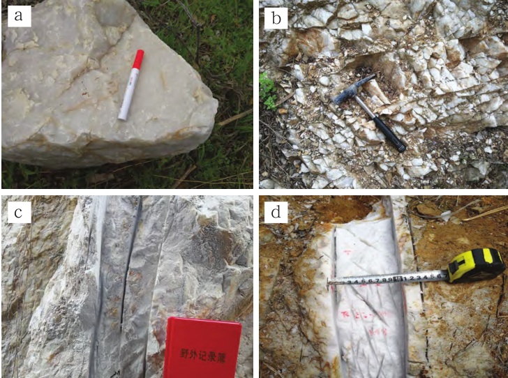 新縣方崗一帶脈石英礦礦床:區內共發現4條不同用途的礦體,其中,兩條礦體可作為高純石英原料脈石英。