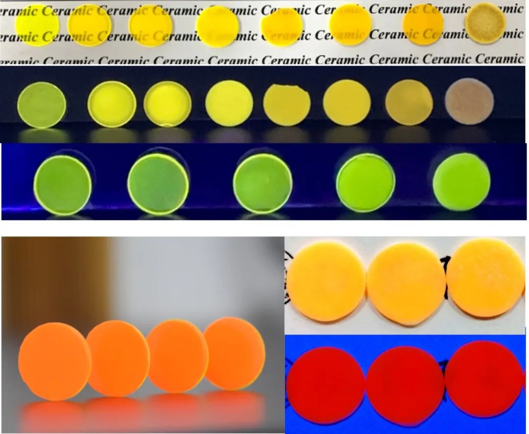 張樂團隊研發的激光照明用多色(黃綠-橙-紅)熒光陶瓷樣品