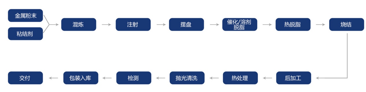 據中國領先的金屬注射成形(MIM)制造企業東睦股份介紹,MIM產品的生產工藝流程為:首先,選取符合MIM要求的金屬粉體與有機粘結劑,在一定溫度條件下,采用適當的方法混合成均勻的喂料,然后,經制粒后在加熱塑化狀態下,用注射成形機注入模具型腔內獲得成形坯,再經過化學或溶劑萃取的方法脫脂處理,最后經燒結致密化得到最終產品。