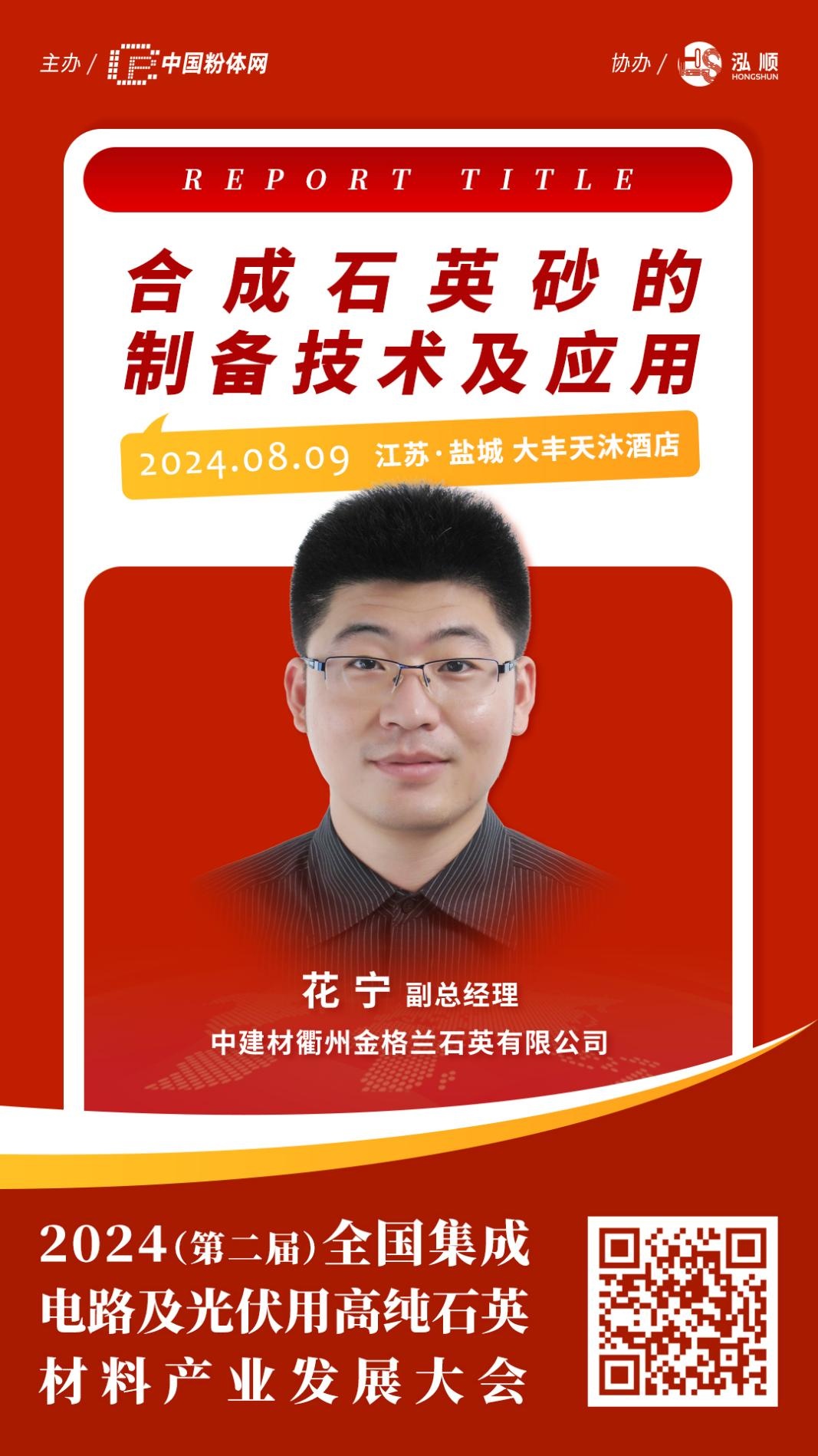 2024年8月9日,由中國粉體網主辦的“2024(第二屆)全國集成電路及光伏用高純石英材料產業發展大會”將在江蘇鹽城召開,中建材衢州金格蘭石英有限公司的花寧副總經理將做《合成石英砂的制備技術及應用》的報告,屆時,他將結合公司實際研發經驗,詳細解讀合成石英砂的生產技術及應用領域。