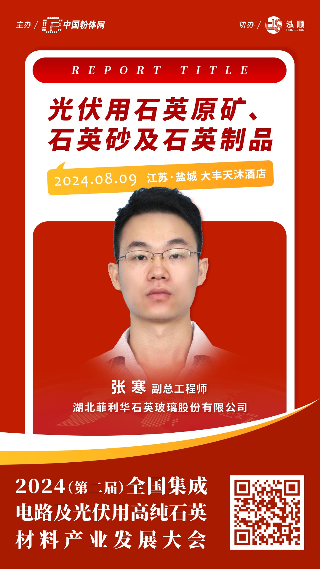 2024年8月9日,由中國粉體網主辦的“2024(第二屆)全國集成電路及光伏用高純石英材料產業發展大會”將在江蘇鹽城召開,湖北菲利華石英玻璃股份有限公司的張寒副總工程師將做《光伏用石英原礦、石英砂及石英制品》的報告,屆時,他將結合公司實際研發經驗,詳細解讀光伏用石英原礦、石英砂及石英制品。