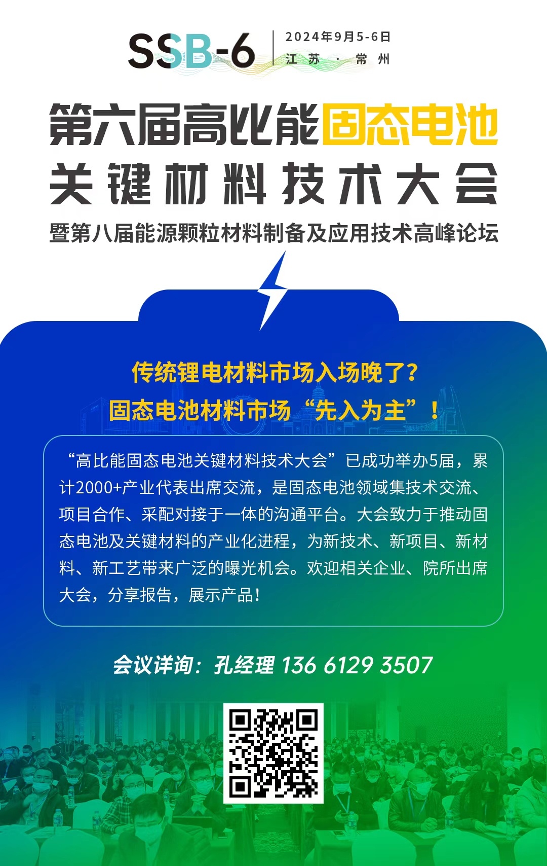 9月5-6日江蘇常州,第六屆高比能固態(tài)電池關(guān)鍵材料技術(shù)大會重磅來襲!CATL/比亞迪/國軒/蜂巢/清陶/贛鋒鋰電/LG/中科固能/合源鋰創(chuàng)/高能時代/濰柴…...業(yè)界耳熟能詳?shù)墓虘B(tài)電池公司齊聚一堂,共襄盛舉。本次大會是固態(tài)電池領(lǐng)域集技術(shù)交流,項目合作、采配對接于一體的溝通平臺,在這里,您可以與“行業(yè)巨頭”面對面交流,實現(xiàn)供應(yīng)鏈現(xiàn)場對接!機不可失時不再來,歡迎相關(guān)企業(yè)、院所出席大會!