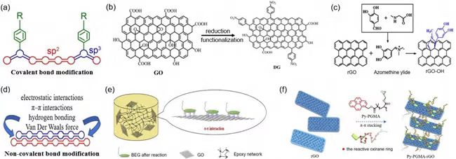 (d)石墨烯非共價鍵修飾原理;(e)π-π 鍵吸附改性 GO;(f)π-π 鍵吸附改性 rGO