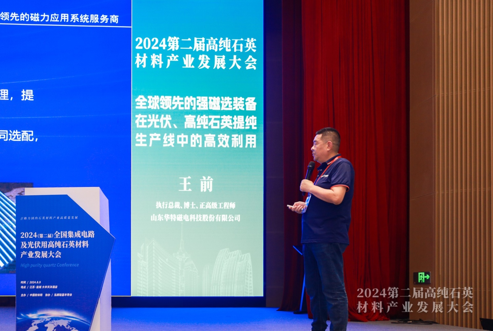 山東華特磁電科技股份有限公司營銷中心副總經理兼非金屬礦事業部部長付有良代執行總裁王前作《全球領先的強磁選裝備在光伏、高純石英提純生產線中的高效利用》報告